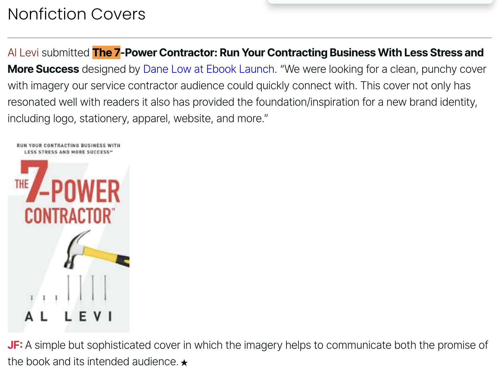 For the cover, I generated a detailed design brief with examples for Ebooklaunch.com, and the cover they created became the inspiration for the new The 7-Power Contractor® logo and branding. April 2017 Gold Star Award for Nonfiction from The Book Designer.